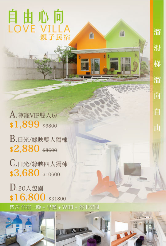 只要1899元起,即可享有【宜蘭-自由心向系列 LoveVilla愛度假親子民宿】溜滑梯溜向自由ABCD住宿專案〈含A.尊寵VIP雙人房 / B.(日光/綠映雙人獨棟) / C.(日光/綠映四人獨棟) / D.20人包園 住宿一晚 + 早餐 + WIFI + 停車空間〉