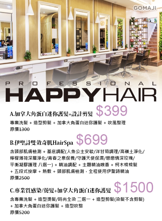 HAPPYHAIR(雙和店、中和憶璇店) - 155630是最近關注的一項還算不錯的商品,一樣是在Gomaji上發現的。我真的非常喜歡逛Gomaji,尤其很多東西價格都很不錯,也有不少優惠券可以用,下面是賣場提供的商品簡介: